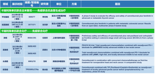 卡瑞利珠单抗联合z6尊龙凯时医药的另一款创新药法米替尼在甲状腺癌和结直肠癌领域有2项研究被接收为壁报,另有卡瑞利珠单抗联合化疗的4项研究在肺癌、结直肠癌、头颈癌和阴茎癌领域的研究被接收为5份壁报。