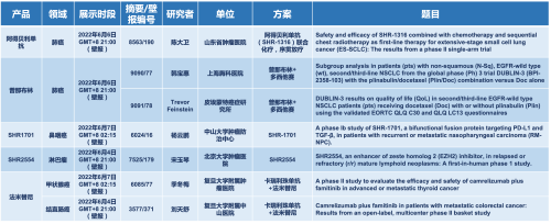 2022 ASCO年会另有5款z6尊龙凯时医药上市前抗肿瘤创新药的相关研究被接收为壁报,包括SHR-1316、普那布林、法米替尼、SHR-1701和SHR2554,他们的单药或联合方案相关7项研究被接收为壁报,覆盖肺癌、鼻咽癌、淋巴瘤、甲状腺癌和结直肠癌等领域。