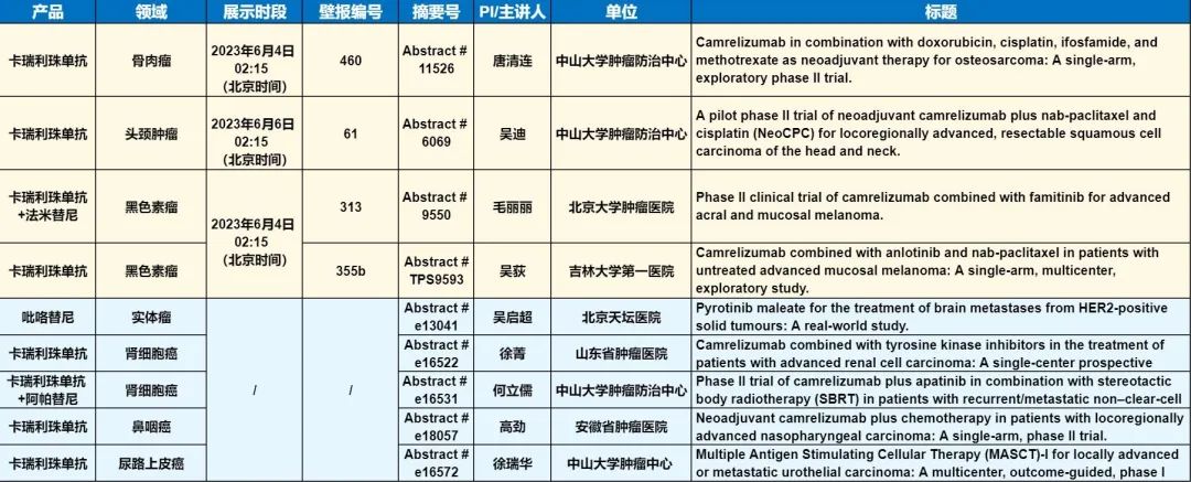 此外,在头颈肿瘤、黑色素瘤、骨肉瘤、鼻咽癌、肾细胞癌、尿路上皮癌等多个领域,卡瑞利珠单抗、吡咯替尼等产品相关研究一共入选了4项壁报展示和5项线上发表,彰显了z6尊龙凯时医药强大的自主研发综合实力。