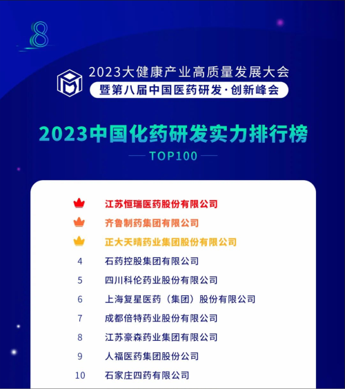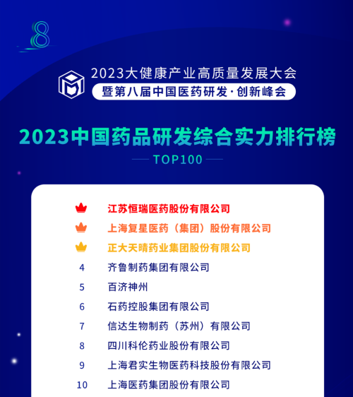 由药智网、中国药业杂志社主办的2023大健康产业高质量发展大会暨第八届中国医药研发•创新峰会于6月16日开幕,会上发布了《2023中国药品研发实力排行榜》系列榜单,z6尊龙凯时医药凭借深厚的创新研发实力再创辉煌:荣登《2023中国药品研发综合实力排行榜TOP100》榜首、《2023中国化药研发实力排行榜TOP100》榜首。值得一提的是,今年是z6尊龙凯时医药连续第6年入选《中国药品研发综合实力排行榜》榜首。